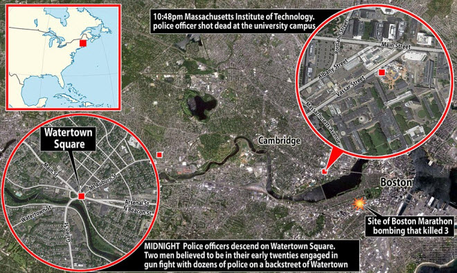 وبدأت مطاردة الرجلين ليلا في كامبريدج في حرم جامعة ماساتشوسيتس للتكنولوجيا غرب بوسطن.