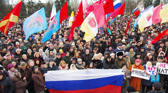 ودونيتسك الواقعة في منطقة دونباس هي موطن لكثير من الناطقين بالروسية. وأبدى المشاركون في التجمع الحاشد تأييدهم لإجراء استفتاء في القرم على الاتحاد مع روسيا والذي من المقرر إجراؤه في 16 مارس (آذار) وقالوا إنه لم يعد هناك اتحاد مع أوكرانيا.