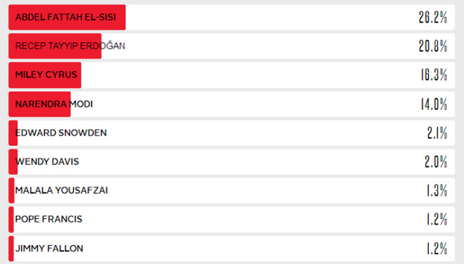 فبعد إغلاق باب المشاركة في الاستفتاء صباح اليوم الخميس، حصل السيسي على 26,2 بالمئة من أصوات القرّاء، وحصل أردوغان على 20,8 بالمئة، بينما حلت النجمة الأميركية مايلي سايروس في المرتبة الثالثة بنسبة 16,3 بالمئة، والسياسي الهندي الشهير نارى نودا مودي في المرتبة الرابعة. وخرج الرئيس الايراني حسن روحاني والرئيس السوري بشار الاسد من قائمة عشرين شخصية شهيرة للعام 2013.